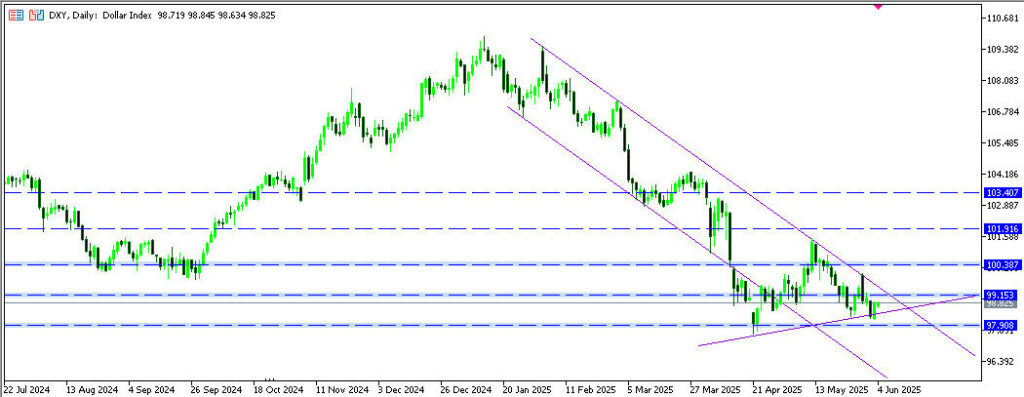 ดัชนีดอลลาร์พยายามกลับมายืนเหนือแนวโน้มขาขึ้นจากจุดต่ำสุดของปีที่ระดับ 99.15 หากยืนได้ อาจมีลุ้นขึ้นทดสอบแนวต้าน 100.00 ขณะที่แนวรับสำคัญอยู่ที่ 97.90