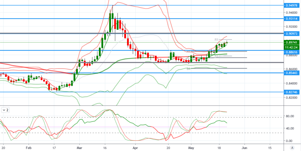 กราฟ EUR/GBP แข็งค่าขึ้นไปชนเพดาน monthly R1 ที่บริเวณ .9021 โดยมีค่า VWAP เป็นบวก ซึ่งถ้าราคาสามารถทรงตัวเหนือ .8861 ได้ต่อเนื่อง ก็มีโอกาสที่จะยังเป็นเทรนด์ขาขึ้นต่อไปทดสอบแนวต้าน .9097 และ yearly R1