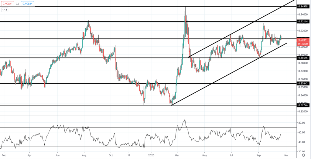 แนวโน้ม EUR/GBP ในระยะกลางยังมีภาพรวมเป็นขาขึ้น อย่างไรก็ตาม หากราคาปรับฐานลงต่ำกว่า .8861 ซึ่งเป็นจุดต่ำสุดของ trend ดังกล่าว ก็อาจมีโอกาสอ่อนค่าลงต่อ