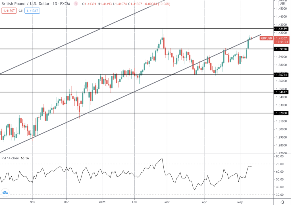 เช้าวันนี้มีการรายงานตัวเลข GDP ไตรมาส 1 ของอังกฤษซึ่งติดลบเพียง -1.5%. (ดีกว่าที่คาดการณ์ล่วงหน้าไว้ -1.7%) ส่วนตัวเลขแบบเปรียบเทียบรายเดือน (MoM%) ของเดือน มี.ค.64 ก็มีการขยายตัวจากเดิม โดยออกมาอยู่ที่ 8.7% ซึ่งสูงกว่าเมื่อเดือน มี.ค.63