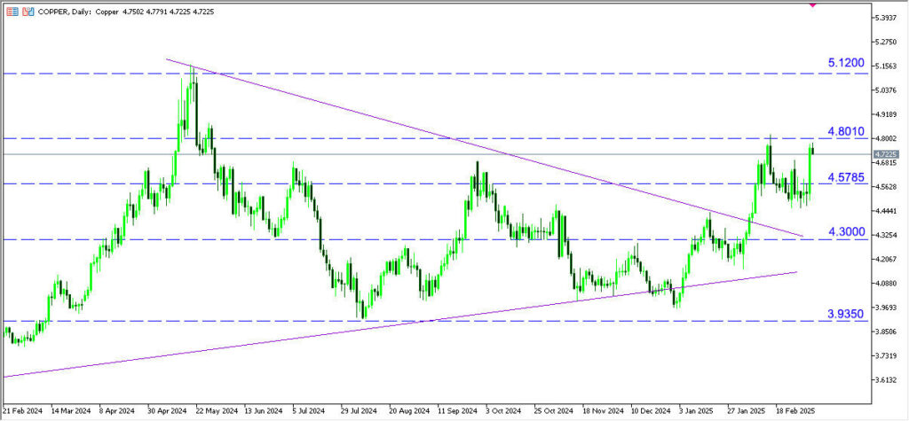 ทองแดงพุ่งต่อ! แม้เผชิญแรงกดดันจากภาษีการค้าสหรัฐฯ แต่ได้แรงหนุนจากดอลลาร์ที่อ่อนค่าลง หลังนักลงทุนแห่ซื้อสินทรัพย์ปลอดภัย หากราคาทะลุแนวต้าน 4.8010 มีโอกาสพุ่งต่อไปแตะระดับ 5.12 โดยตลาดยังจับตาตัวเลขตลาดแรงงานสหรัฐฯ วันศุกร์นี้ ซึ่งอาจส่งผลต่อแนวโน้มดอลลาร์และราคาทองแดง