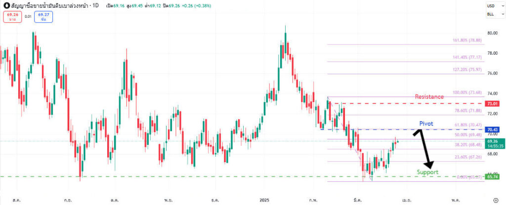 วิเคราะห์ น้ำมันดิบล่วงหน้า (Crude Oil Futures) กราฟ H4 มีแนวโน้มดีดขึ้นทดสอบ Pivot ที่ 70.43 ก่อนกลับตัวลงสู่แนวรับ 65.74 หากทะลุ Pivot ได้ มีโอกาสปรับตัวขึ้นต่อถึงแนวต้านที่ 73.01