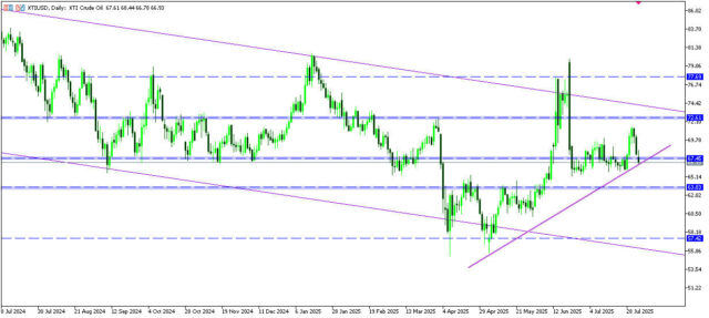 ราคาน้ำมันปรับตัวลดลงต่อเนื่อง หลัง OPEC+ ประกาศเพิ่มกำลังการผลิตเป็นเดือนที่ 5 ท่ามกลางความไม่แน่นอนจากภาษีใหม่ของสหรัฐและสงครามการค้า ขณะที่ข้อมูลจ้างงานสหรัฐต่ำกว่าคาด ยิ่งเพิ่มความกังวลต่อเศรษฐกิจและดีมานด์น้ำมัน แม้เฟดอาจผ่อนคลายนโยบายการเงินในระยะกลาง แต่ในระยะสั้นยังเป็นแรงกดดัน ด้านเทคนิค ราคาหลุดแนวรับ 67.45 และกำลังทดสอบเส้นเทรนด์ โดยมีแนวรับถัดไปที่ 63.83 และแนวต้านสำคัญที่ 72.61