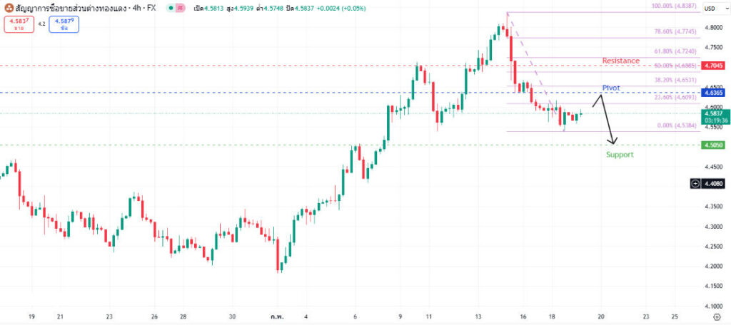 Tickmill Expert วิเคราะห์ ฟิวเจอร์สทองแดง (HG1!) กราฟ H4 กำลังดีดตัวขึ้นสู่แนวต้าน หากไม่ผ่านอาจกลับตัวลงสู่แนวรับ 4.505 แต่หากทะลุ 4.636 มีโอกาสขึ้นต่อไปที่ 4.704