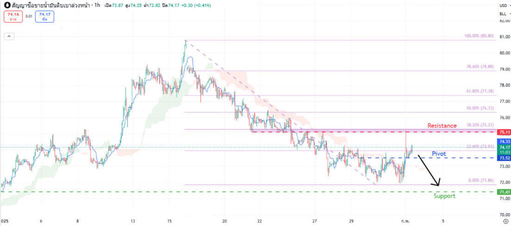 ราคาน้ำมันดิบฟิวเจอร์ส (CL1!) บนกราฟ H1 กำลังปรับตัวลงสู่ระดับ Pivot ที่ 73.52 ซึ่งเป็นจุดเสี่ยงต่อการเกิด Bearish Breakout หากทะลุลง อาจลงต่อไปที่แนวรับ 71.41 แต่หากดีดกลับ อาจขึ้นไปทดสอบแนวต้าน 75.11