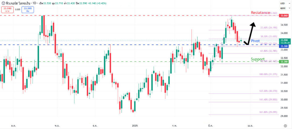 Tickmill Expert วิเคราะห์ ฟิวเจอร์สเงิน (SI1!) ราคาอาจอ่อนตัวลงสู่แนวรับ pullback ใกล้ระดับ Fibonacci 50% และมีโอกาสทรงตัวก่อนดีดกลับขึ้นไปยังแนวต้านที่ 35.06 แต่หากราคาหลุดต่ำกว่าจุด Pivot ที่ 33.30 อาจไหลลงต่อสู่แนวรับถัดไปที่ 32.28