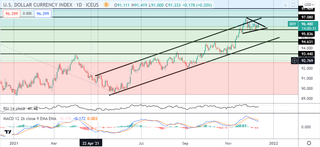 ดัชนีดอลลาร์สหรัฐฯ (DXY) ย่อตัวลงมาอยู่ในรูปสามเหลี่ยมบริเวณขอบบนของกรอบ bull channel โดยหากราคาทรงตัวอยู่เหนือ 95.83 ได้ก็มีแนวโน้มจะแข็งค่าต่อไปทดสอบระดับ 97.90 แต่ในทางตรงข้ามถ้าเกิดการอ่อนค่าลงจากนี้ ก็จะมีแนวรับถัดไปอยู่ที่ 94.63 และที่บริเวณขอบล่างของ bull channel ตามลำดับ