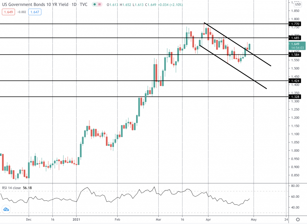 ที่ประชุม FOMC ประจำเดือน เม.ย. มีมติให้ใช้นโยบายการเงินแบบผ่อนคลายต่อไป โดยยังคงอัตราดอกเบี้ยนโยบายไว้ที่ 0.10% และกำหนดมูลค่าการรับซื้อทรัพย์สินรายเดือนไว้ที่ 1.2 แสนล้านดอลล่าร์ฯ ตามเดิม