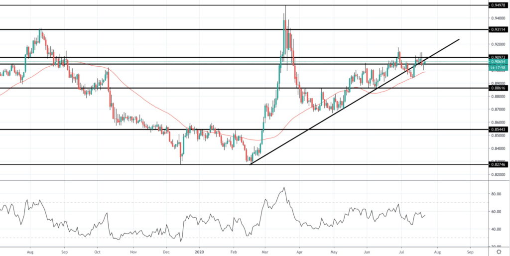 เกิดการเปลี่ยนแนวโน้มของเส้น trend line โดยราคาปรับฐานลงมาถึงจุดต่ำสุดของรอบปี หลังจากไม่สามารถรักษาภาวะขาขึ้นที่ระดับ .9097 ไว้ได้ ทั้งนี้ แม้ว่าในภาพรวมราคาจะยังเคลื่อนไหวอยู่เหนือระดับ 50 DMA แต่ดัชนี RSI แสดงสัญญาณกลับทิศทางเป็นขาลง (bearish divergence) หลังจากนี้จึงอาจมีโอกาสอ่อนค่าลงมายังแนวรับ .8861 ได้