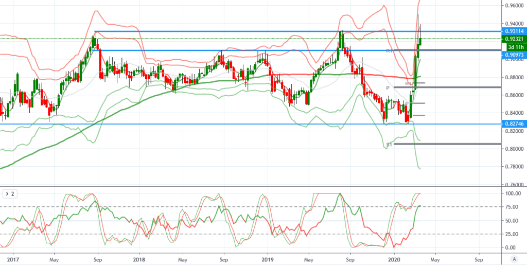 เงินปอนด์แข็งค่าขึ้นมาทดสอบเพดาน 0.9311 ซึ่งเป็นจุดสูงสุดของราคาในปี 60 และ 62 โดยมีสัญญาณทางเทคนิคยืนยันแนวโน้มขาขึ้น ทั้งนี้ มีโอกาสเกิดการปรับฐานลงบริเวณ R1 ที่ระดับ 0.9097