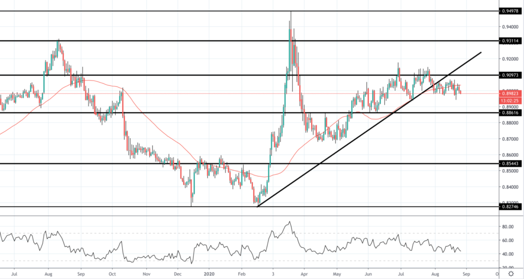 ราคาหยุดชะงักอยู่ที่ช่วง .8970-90 โดยมีความเคลื่อนไหวอยู่ต่ำกว่าค่าเฉลี่ย 50DMA และมีแนวรับล่าสุดอยู่ที่บริเวณ .8861 อย่างไรก็ดี หลังจากนี้ยังไม่มีแนวโน้มที่แน่ชัดว่าราคาจะกลับไปเป็นขาขึ้นได้ตามเดิมหรือไม่ ซึ่งหากไม่สามารถแข็งค่าต่อไป ก็จะเกิดแนวรับใหม่ลงมาอยู่ที่ประมาณ .8544