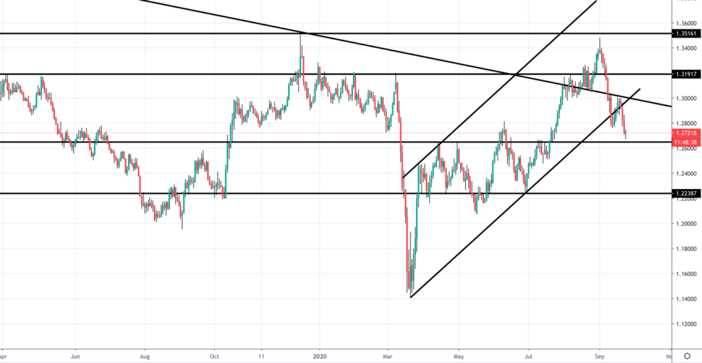 GBP/USD ปรับตัวอ่อนค่าลง โดยมีทิศทางไปยังแนวรับ 1.2649 ซึ่งหากมีการเคลื่อนไหวลงมาต่ำกว่าระดับดังกล่าว ก็จะมีแนวโน้มเป็นขาลงต่อไปได้ถึงแนวรับ 1.2238 อย่างไรก็ตาม หากสามารถรักษาระดับปัจจุบันไว้ได้ ก็อาจมีโอกาสปรับฐานขึ้นมาที่ประมาณ 1.3191