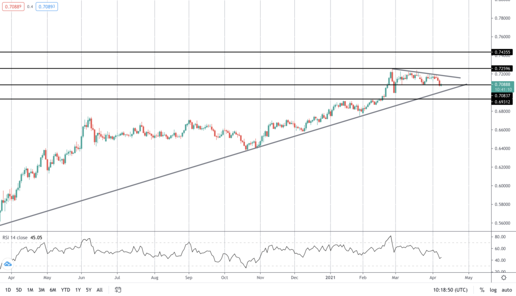 ตั้งแต่ต้นปีที่ผ่านมา AUD/CHF แข็งค่าขึ้นต่อเนื่องราว 8% เพราะปัจจัยบวกจากการที่ออสเตรเลียสามารถฟื้นตัวจากสถานการณ์โรคระบาดได้ดี แม้ว่าธนาคารกลาง (RBA) ยืนยันจะยังคงใช้อัตราดอกเบี้ยนโยบายเดิมในระดับที่ต่ำมากไปจนถึงปี 67 เป็นอย่างน้อย ในขณะที่ภาพรวมของการฟื้นตัวทั่วโลกยังคงมีความเสี่ยงสูง