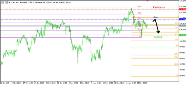 วิเคราะห์คู่เงิน AUDJPY บนกราฟ H1 มีแนวโน้มกลับตัวลงจากโซน 101.20 ซึ่งเป็นแนวต้านจากการย่อตัวและสอดคล้องกับ Fibonacci 61.8% หากราคาย่อลง มีโอกาสลงไปทดสอบแนวรับแรกที่ 100.36 แต่หากราคาทะลุแนวต้านดังกล่าวขึ้นไป อาจเห็นการปรับตัวขึ้นต่อสู่แนวต้านถัดไปที่ 101.73