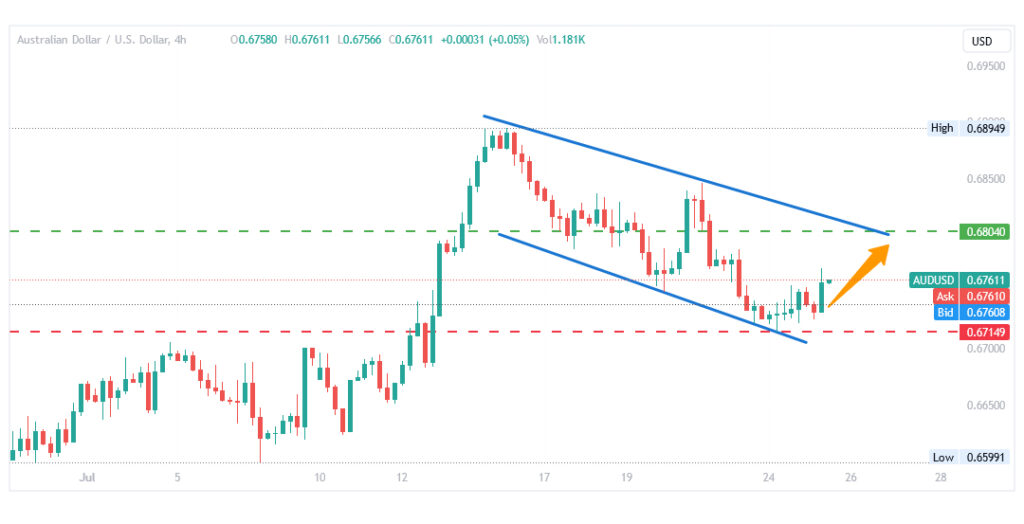 มีจุดทำกำไรที่บริเวณใกล้ๆแนวต้านระดับ 0.6804 และจุดตัดขาดทุนควรต่ำกว่าแนวรับที่บริเวณระดับ 0.6715