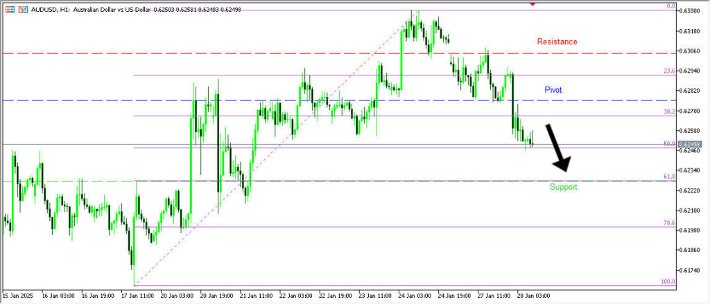 วิเคราะห์ AUDUSD กรอบเวลา H1 มีแนวโน้มขาลงต่อเนื่อง: ราคาต่ำกว่าระดับ Pivot 0.62763 หากไม่ทะลุขึ้น อาจลงสู่แนวรับ 0.62274 ที่ Fibonacci 61.80% แต่หากทะลุ Pivot อาจขึ้นถึงแนวต้าน 0.63045.