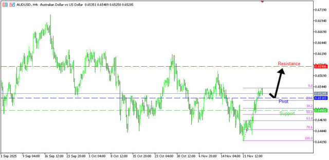 ราคากำลังอ่อนตัวลงเข้าหาโซน Pivot ที่ 0.6518 ซึ่งเป็นแนวรับแบบ Overlap หากราคาดีดกลับจากบริเวณนี้ มีโอกาสขึ้นไปทดสอบแนวต้านแรกที่ 0.6590 แต่หากหลุดโซน Pivot ลงมา ราคามีสิทธิ์อ่อนต่อไปสู่แนวรับถัดไปที่ 0.6490 ซึ่งสอดคล้องกับระดับ Fibonacci 38.2%