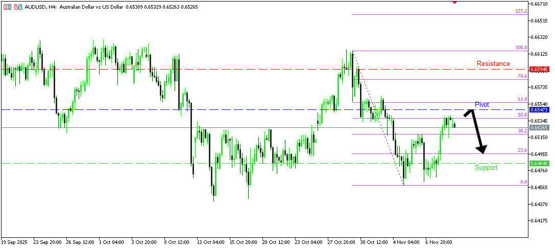 วิเคราะห์คู่เงิน AUDUSD บนกราฟ H4 มีแนวโน้มกลับตัวลงจากแนวต้านบริเวณ 0.6547 ซึ่งเป็นแนวต้านจากการดีดกลับและอยู่เหนือระดับ Fibonacci 50% เล็กน้อย โดยหากราคากลับตัวลง คาดว่าจะปรับลดสู่แนวรับถัดไปที่ 0.6485 แต่หากราคาทะลุแนว 0.6547 ขึ้นไปได้ มีโอกาสขยับขึ้นต่อไปยังแนวต้านถัดไปที่ 0.6594