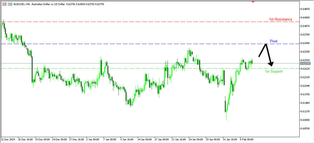 วิเคราะห์ AUDUSD กรอบเวลา H4 ราคากำลังปรับตัวขึ้นสู่แนวต้าน 0.6346 ซึ่งเป็นแนว Pullback Resistance หากกลับตัวลง อาจร่วงสู่แนวรับ 0.6262 ที่เป็นแนว Overlap แต่หากทะลุขึ้นไป อาจพุ่งสู่แนวต้านถัดไปที่ 0.6421