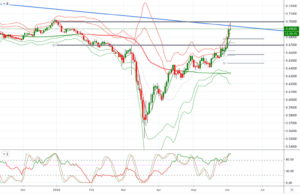 ปัจจุบันมีแนวรับอยู่ที่ 1.10 และมีทิศทางแข็งค่าไปที่ 1.1235 ซึ่งเป็นแนวต้าน monthly R1 และ weekly R1 ดังนั้นจึงมีแนวโน้มจะเกิด profit taking...
