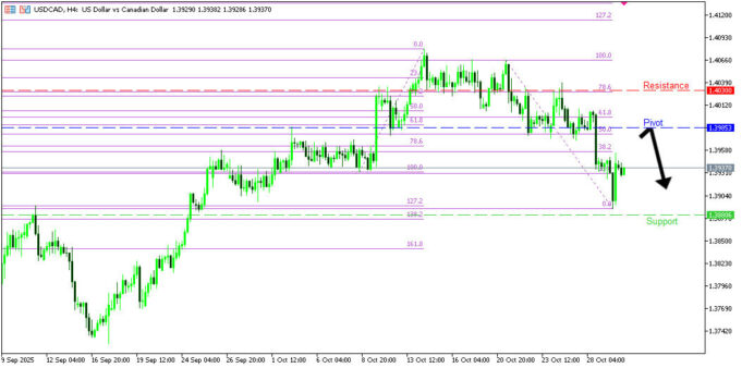 วิเคราะห์ USDCAD บนกราฟ H4 มีแนวโน้มกลับตัวลงต่อเนื่องราคากำลังปรับขึ้นเข้าใกล้โซน 1.3985 ซึ่งเป็นแนวต้าน Overlap ใกล้ระดับ Fibonacci 50% หากราคากลับตัวจากบริเวณนี้ มีโอกาสปรับลงต่อสู่แนวรับที่ 1.3880 ซึ่งสอดคล้องกับระดับ Fibonacci Extension 127.2% แต่หากราคาทะลุเหนือ 1.3985 ขึ้นไป อาจขยับขึ้นทดสอบแนวต้านถัดไปบริเวณ 1.4030 ใกล้ระดับ Fibonacci 78.6%