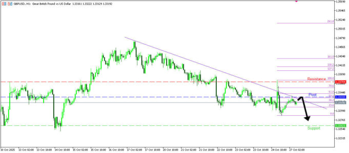 วิเคราะห์ GBPUSD บนกราฟ H1 มีแนวโน้มกลับตัวลงจากแนวต้านบริเวณ 1.3333 ซึ่งสอดคล้องกับระดับ Fibonacci 50% หากราคากลับตัวจากโซนนี้ มีโอกาสปรับลงสู่แนวรับที่ 1.3262 แต่หากราคาทะลุเหนือ 1.3333 ขึ้นไป อาจขยับขึ้นทดสอบแนวต้านถัดไปบริเวณ 1.3370