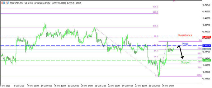 วิเคราะห์ USDCAD บนกราฟ H1 มีแนวโน้มปรับตัวลงจากโซนแนวต้านหลักบริเวณ 1.4000 ซึ่งเป็นแนวต้าน Overlap ใกล้ระดับ Fibonacci 61.8% หากราคาย่อตัวจากบริเวณนี้ มีโอกาสปรับลงต่อสู่แนวรับที่ 1.3943 แต่หากราคาทะลุเหนือ 1.4000 ขึ้นไป อาจขยับขึ้นทดสอบแนวต้านถัดไปบริเวณ 1.4030