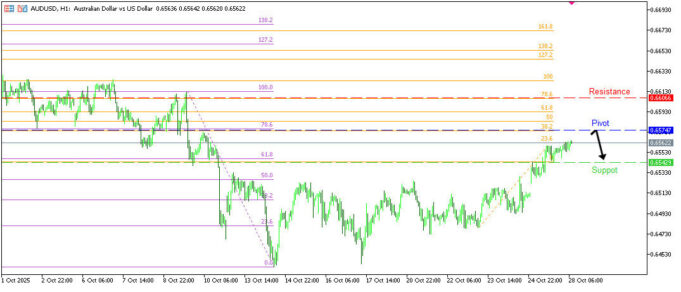 ราคากำลังปรับขึ้นเข้าใกล้โซน 0.6574 ซึ่งเป็นแนวต้าน Overlap ใกล้ระดับ Fibonacci Retracement 78.6% และ Fibonacci Extension 161.8% หากราคากลับตัวจากบริเวณนี้ มีโอกาสปรับลงสู่แนวรับที่ 0.6542 แต่หากราคาทะลุเหนือ 0.6574 ขึ้นไป อาจขยับขึ้นทดสอบแนวต้านถัดไปบริเวณ 0.6606