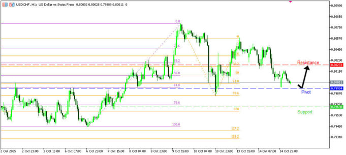 วิเคราะห์ USDCHF บนกราฟ H1 มีแนวโน้มดีดตัวขึ้นจากแนวรับสำคัญราคากำลังปรับตัวลงเข้าใกล้โซน 0.7993 ซึ่งเป็นแนวรับ Overlap ใกล้ระดับ Fibonacci Projection 61.8% หากราคาดีดตัวจากบริเวณนี้ มีโอกาสปรับขึ้นสู่แนวต้านที่ 0.8023 แต่หากราคาหลุดต่ำกว่า 0.7993 อาจอ่อนตัวลงต่อสู่แนวรับถัดไปบริเวณ 0.7969 ใกล้ระดับ Fibonacci Retracement 78.6%