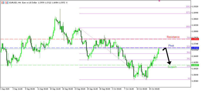 วิเคราะห์ EURUSD บนกราฟ H4 ราคากำลังปรับขึ้นเข้าใกล้โซน 1.1712 ซึ่งเป็นแนวต้าน Overlap ใกล้ระดับ Fibonacci 61.8% หากราคากลับตัวจากบริเวณนี้ มีโอกาสปรับลงต่อสู่แนวรับที่ 1.1620 แต่หากราคาทะลุเหนือ 1.1712 ขึ้นไป อาจขยับขึ้นทดสอบแนวต้านถัดไปบริเวณ 1.1759 ซึ่งตรงกับระดับ Fibonacci 78.6%