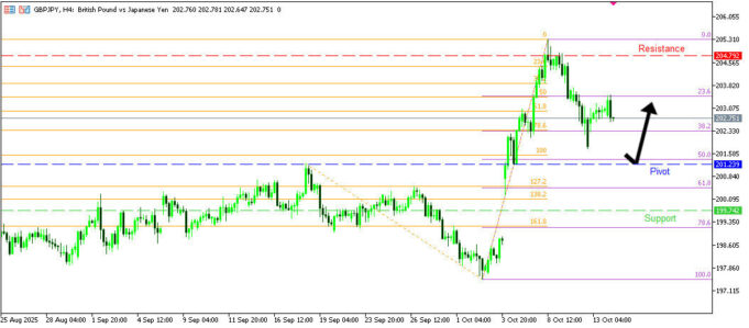 วิเคราะห์ GBPJPY บนกราฟ H4 ราคากำลังปรับลงสู่แนวรับจากการย่อตัวราคากำลังอ่อนตัวลงมาที่โซน 201.23 ซึ่งเป็นแนวรับจากการย่อตัว (Pullback Support) และสอดคล้องกับระดับ Fibonacci 50% และ Projection 100% หากเกิดการดีดตัวจากบริเวณนี้ มีโอกาสที่ราคาจะปรับขึ้นไปทดสอบแนวต้านถัดไปที่ 204.79 แต่หากราคาหลุดต่ำกว่า 201.23 อาจเห็นการปรับตัวลงต่อสู่แนวรับถัดไปบริเวณ 199.74