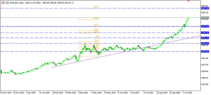 ราคาทองคำพุ่งทำจุดสูงสุดใหม่ต่อเนื่อง จากแรงหนุนสองทาง—ความตึงเครียดทางการค้าระหว่างสหรัฐฯ–จีนที่กลับมาระอุ และมุมมองเฟดสายผ่อนคลายหลังพาวเวลล์ส่งสัญญาณใกล้ยุติการลดงบดุล (QT) และอาจลดดอกเบี้ยเพิ่มอีก 0.5% ภายในปีนี้ ดอลลาร์ที่อ่อนค่าช่วยหนุนแรงซื้อทองต่อเนื่อง ด้านเทคนิคทองยังอยู่ในแนวโน้มขาขึ้น มีแนวต้านถัดไปแถว 4,505 ดอลลาร์ และแนวรับสำคัญที่ 3,977 ดอลลาร์
