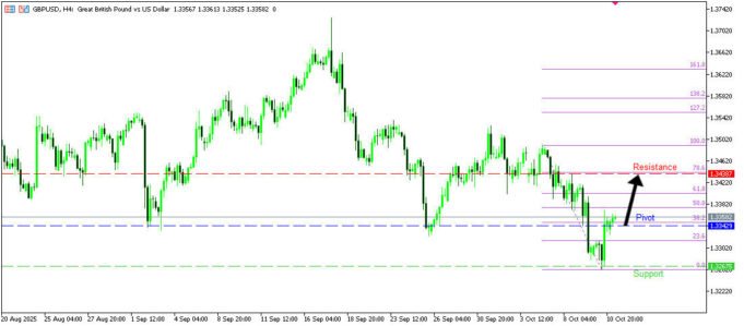 วิเคราะห์ GBPUSD บนกราฟ H4 ราคาดีดตัวจากโซน Pivot 1.3342 ซึ่งเป็นแนวรับจากการย่อตัว (Pullback Support) มีแนวโน้มปรับขึ้นต่อสู่แนวต้าน 1.3438 ซึ่งเป็นแนวต้าน Overlap และตรงกับระดับ Fibonacci 78.6% แต่หากราคาหลุดต่ำกว่า 1.3342 อาจอ่อนตัวลงต่อสู่แนวรับถัดไปที่ 1.3267 ซึ่งเป็นแนวรับ Overlap เช่นกัน