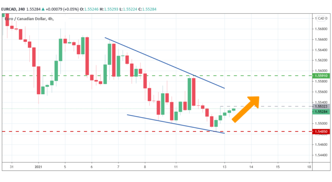 EURCAD formed the Falling Wedge pattern with time-frame 4 Hours.In the short term, the price may rise up to test the resistance level 1.5591.Take profit: near the resistance level 1.5591.Stop loss: should below the support level 1.5485.