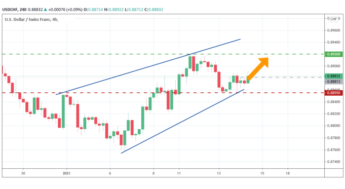 USDCHF คู่นี้เป็น pattern แบบ Rising Wedge โดยรูปแบบราคาจาก Time frame 4 ชั่วโมงในระยะสั้นมีแนวโน้มที่ราคาจะขึ้นไปทดสอบที่บริเวณแนวต้านระดับ 0.8920มีจุดทำกำไรที่บริเวณใกล้ๆแนวต้านระดับ 0.8920 และจุดตัดขาดทุนควรต่ำกว่าแนวรับที่บริเวณระดับ 0.8855