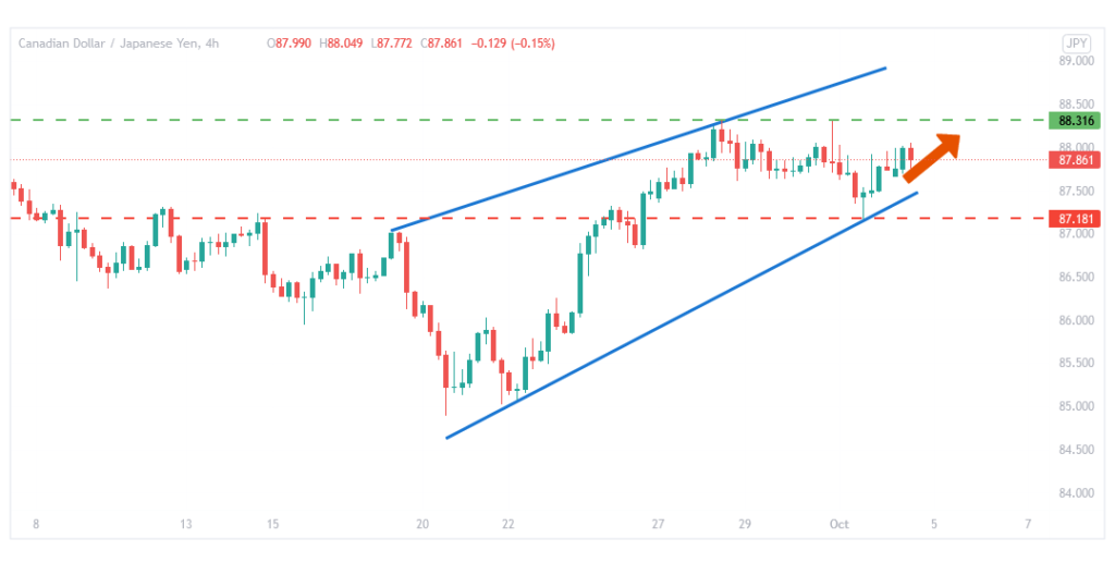 CADJPY คู่นี้เป็น pattern แบบ Rising Wedge โดยรูปแบบราคาจาก Time frame 4 ชั่วโมง