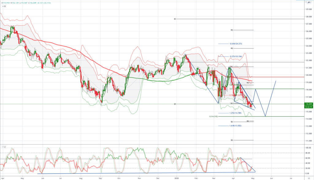 สำหรับกราฟ EUR/JPY เกิดสัญญาณราคาแบบ descending wedge (สามเหลี่ยมแหลมลง) โดยมีทิศทางไปยังบริเวณแนวรับ 115.50 ซึ่งเป็นจุด pivot point รวมทั้งเป็นจุดต่ำสุดของปีที่แล้ว ดังนั้น จึงมีโอกาสที่ตลาดจะกลับแนวโน้มเป็นขาขึ้น หากสามารถแข็งค่าได้มากกว่า 116 (ระดับ volume weighted average price—VWAP) แล้วขึ้นต่อไปถึงแนวต้าน 118-120