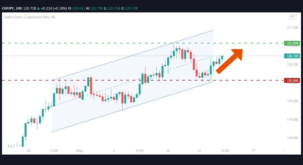 CHFJPY 13/5/21 MKT 4 years ago CHFJPY คู่นี้เป็น pattern แบบ Channel up โดยรูปแบบราคาจาก Time frame 4 ชั่วโมงในระยะสั้นมีแนวโน้มที่ราคาจะขึ้นไปทดสอบที่บริเวณแนวต้านระดับ 121.0780มีจุดทำกำไรที่บริเวณใกล้ๆแนวต้านระดับ 121.0780 และจุดตัดขาดทุนควรต่ำกว่าแนวรับที่บริเวณระดับ 120.0680