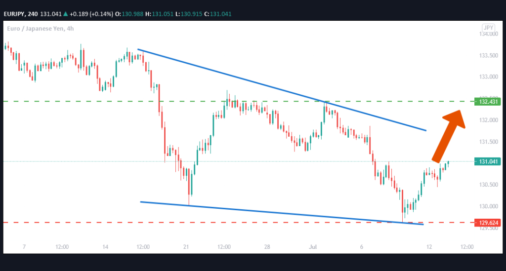 EURJPY คู่นี้เป็น pattern แบบ Falling Wedge โดยรูปแบบราคาจาก Time frame 4 ชั่วโมง