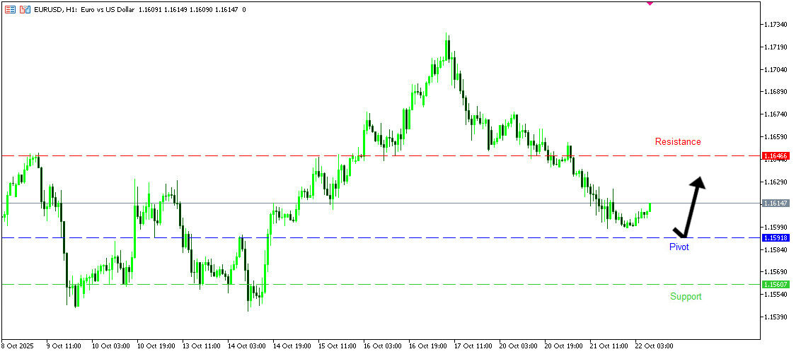 วิเคราะห์ EURUSD บนกราฟ H1 มีแนวโน้มดีดตัวขึ้นจากแนวรับ ราคากำลังย่อตัวเข้าใกล้โซน 1.1591 ซึ่งเป็นแนวรับจากการย่อตัว (Pullback Support) หากเกิดการดีดตัวขึ้นจากบริเวณนี้ มีโอกาสปรับขึ้นไปทดสอบแนวต้านแรกที่ 1.1643 ซึ่งเป็นแนวต้าน Overlap แต่หากราคาหลุดต่ำกว่า 1.1591 อาจปรับลงต่อสู่แนวรับถัดไปบริเวณ 1.1560