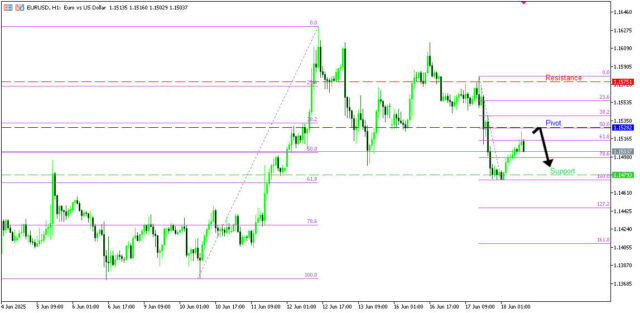 วิเคราะห์ EURUSD กราฟ H1 มีแนวโน้มกลับตัวลง โดยราคากำลังดีดตัวขึ้นใกล้ระดับ pivot ที่ 1.1528 ซึ่งเป็นแนวต้านจากการดึงกลับและตรงกับ Fibonacci 50% หากเกิดการกลับตัวลง มีโอกาสที่ราคาจะร่วงสู่แนวรับที่ 1.1479 ซึ่งเป็นแนวรับซ้อนทับและสอดคล้องกับ Fibonacci 61.8% แต่หากราคาทะลุแนวต้าน pivot ขึ้นไปได้ อาจขึ้นต่อถึงแนวต้านถัดไปที่ 1.1575