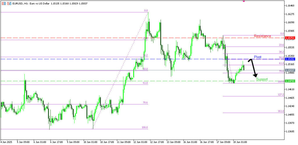 วิเคราะห์ EURUSD กราฟ H1 มีแนวโน้มกลับตัวลง โดยราคากำลังดีดตัวขึ้นใกล้ระดับ pivot ที่ 1.1528 ซึ่งเป็นแนวต้านจากการดึงกลับและตรงกับ Fibonacci 50% หากเกิดการกลับตัวลง มีโอกาสที่ราคาจะร่วงสู่แนวรับที่ 1.1479 ซึ่งเป็นแนวรับซ้อนทับและสอดคล้องกับ Fibonacci 61.8% แต่หากราคาทะลุแนวต้าน pivot ขึ้นไปได้ อาจขึ้นต่อถึงแนวต้านถัดไปที่ 1.1575