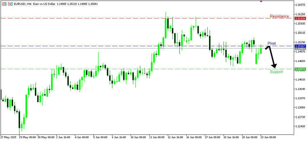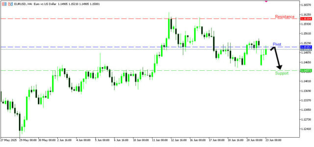 วิเคราะห์ EURUSD กราฟ H4 มีแนวโน้มกลับตัวลง โดยราคากำลังปรับขึ้นเข้าใกล้แนวต้านที่ 1.1515 ซึ่งเป็นแนว pullback resistance หากเกิดการกลับตัวลง อาจร่วงสู่แนวรับแรกที่ 1.1437 ซึ่งเป็นแนวรับจากการดึงกลับเช่นกัน แต่หากราคาทะลุแนวต้าน pivot ขึ้นไปได้ อาจไปต่อถึงแนวต้านถัดไปที่ 1.1610 ซึ่งเป็นบริเวณยอดสูงหลายจุด (multi-swing high)