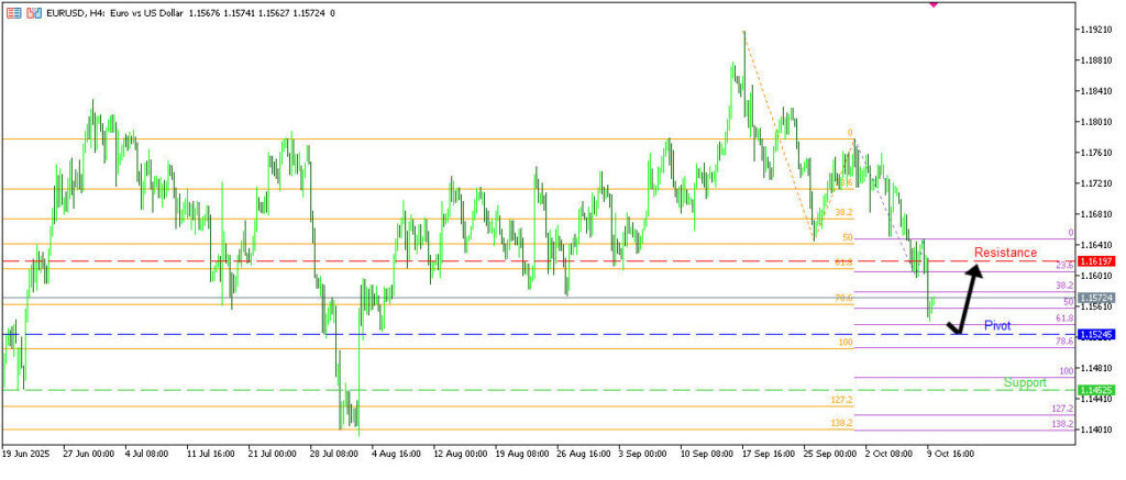 วิเคราะห์ EURUSD บนกราฟ H4 กำลังส่งสัญญาณกลับตัวขึ้น โดยราคาทดสอบแนวรับสำคัญที่ 1.1524 ซึ่งเป็นโซน Pullback Support เหนือระดับ Fibonacci Projection 78.6–100% หากยืนได้มีโอกาสดีดกลับขึ้นสู่แนวต้าน 1.1619 แต่หากหลุดต่ำกว่า 1.1524 อาจร่วงต่อถึงแนวรับถัดไปที่ 1.1452