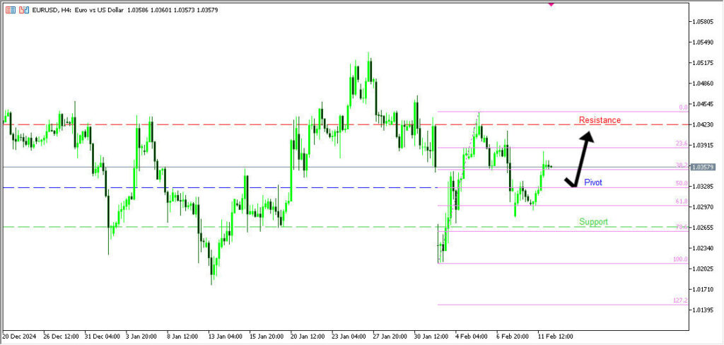 EURUSD กรอบเวลา H4 มีแนวโน้มดีดตัวขึ้น ราคากำลังทดสอบแนวรับ Pivot ที่ 1.0326 หากดีดตัวขึ้น มีโอกาสไปแนวต้าน 1.0423 แต่หากหลุดลง อาจร่วงต่อสู่แนวรับ 1.0266 ซึ่งตรงกับ Fibonacci 78.6%