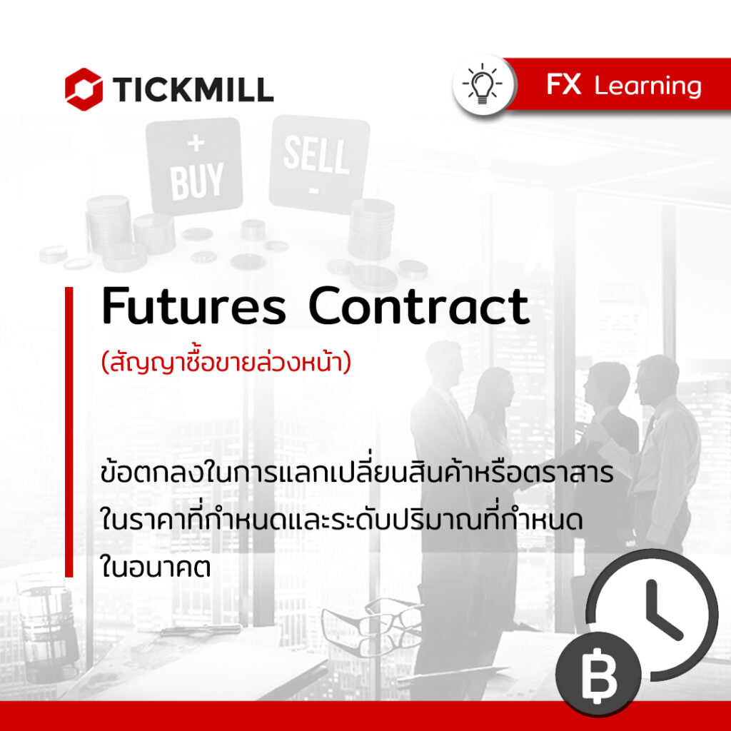 FUTURES CONTRACT (สัญญาซื้อขายล่วงหน้า) คือ ข้อตกลงในการแลกเปลี่ยนสินค้าหรือตราสารในราคาที่กำหนดและระดับปริมาณที่กำหนดในอนาคต