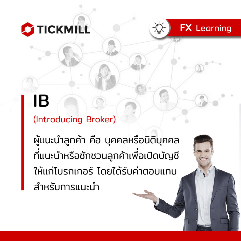 FX Learning – IB MKT 3 years ago IB (Introducing Broker) ผู้แนะนำลูกค้าคือ บุคคลหรือนิติบุคคล ที่แนะนำหรือชักชวนลูกค้าเพื่อเปิดบัญชีให้แก่โบรกเกอร์ โดยได้รับค่าตอบแทนสำหรับการแนะนำ