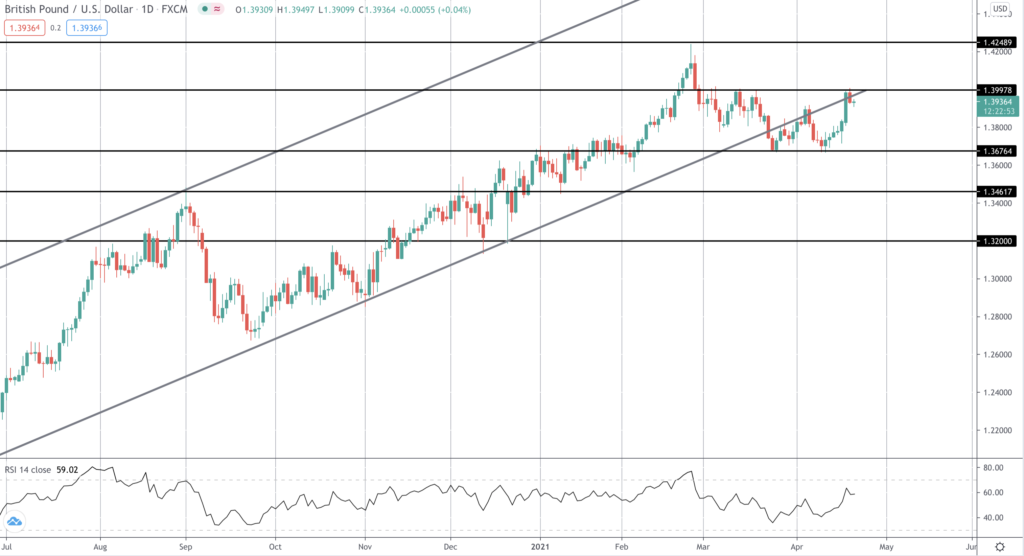 ต้นสัปดาห์นี้ GBP แข็งค่าขึ้นตามความคาดหมายที่เป็นบวกต่อมาตรการเปิดเมือง อีกทั้งยังมีปัจจัยบวกจาก USD ที่อ่อนค่าลง แต่รายงานการขยายตัวของระดับเงินเฟ้อในอังกฤษวันนี้ออกมาต่ำกว่าเป้าหมาย โดยดัชนีราคาผู้บริโภค หรือ CPI ประจำเดือน มี.ค. อยู่ที่ 0.7% ต่ำกว่าเป้าหมายที่ 0.8% (แต่ก็ยังสูงกว่าเดือน ก.พ. ซึ่งอยู่ที่ 0.4%) เช่นเดียวกับดัชนีราคาผู้บริโภคพื้นฐาน หรือ Core CPI ที่ขยายตัวได้มากกว่าเดือน ก.พ. (0.9%) แต่ต่ำกว่าเป้าหมายที่ตั้งไว้ 1.1%