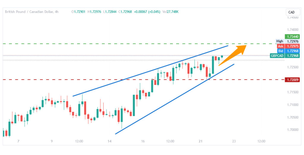 GBPCAD คู่นี้เป็น pattern แบบ Rising Wedge โดยรูปแบบราคาจาก Time frame 4 ชั่วโมง
