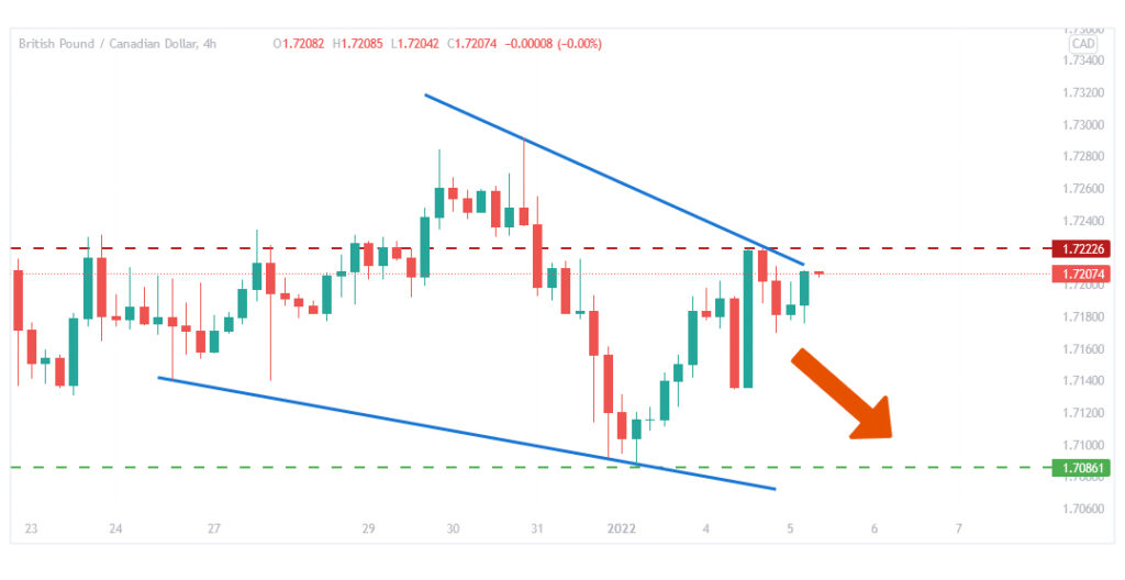 GBPCAD คู่นี้เป็น pattern แบบ Falling Wedge โดยรูปแบบราคาจาก Time frame 4 ชั่วโมง